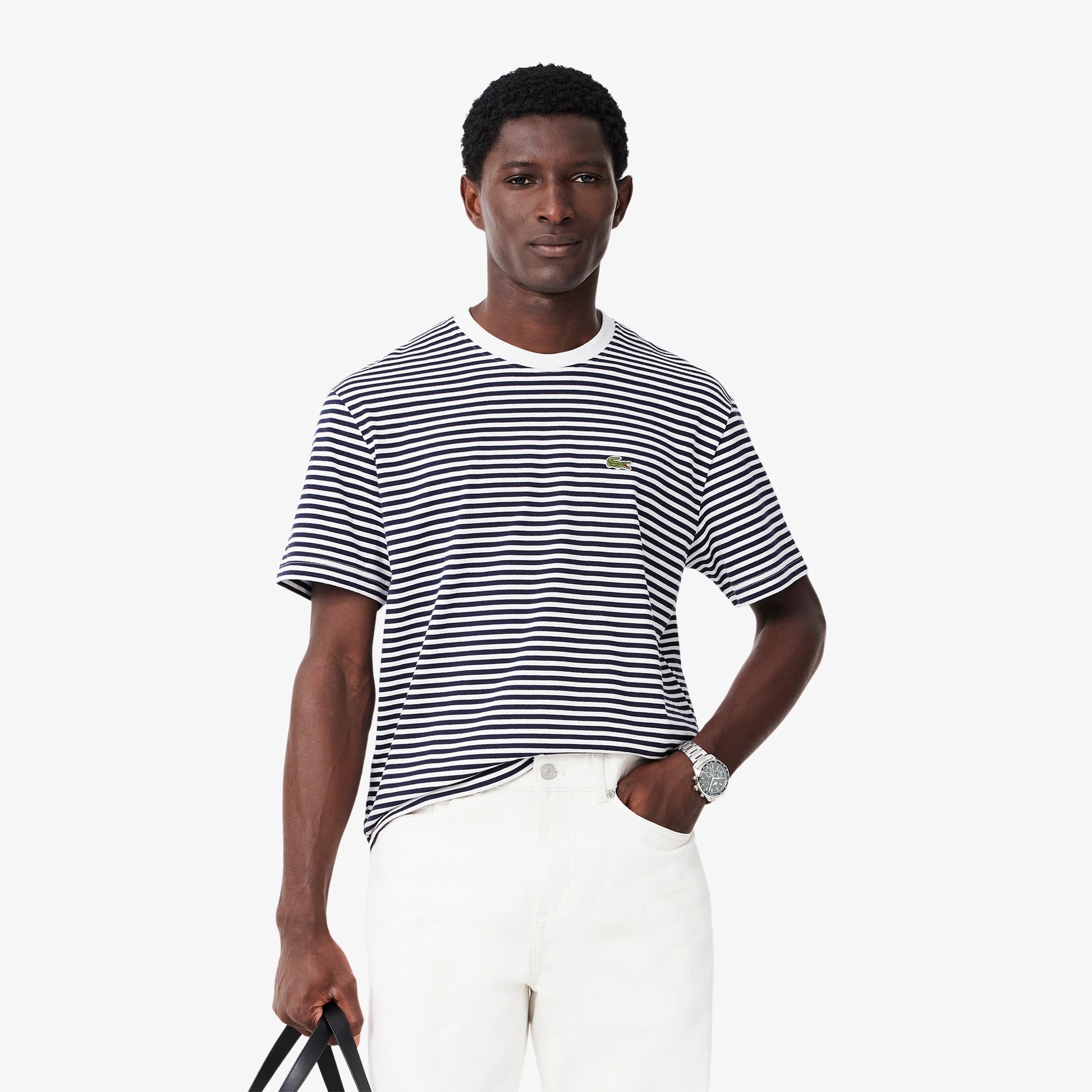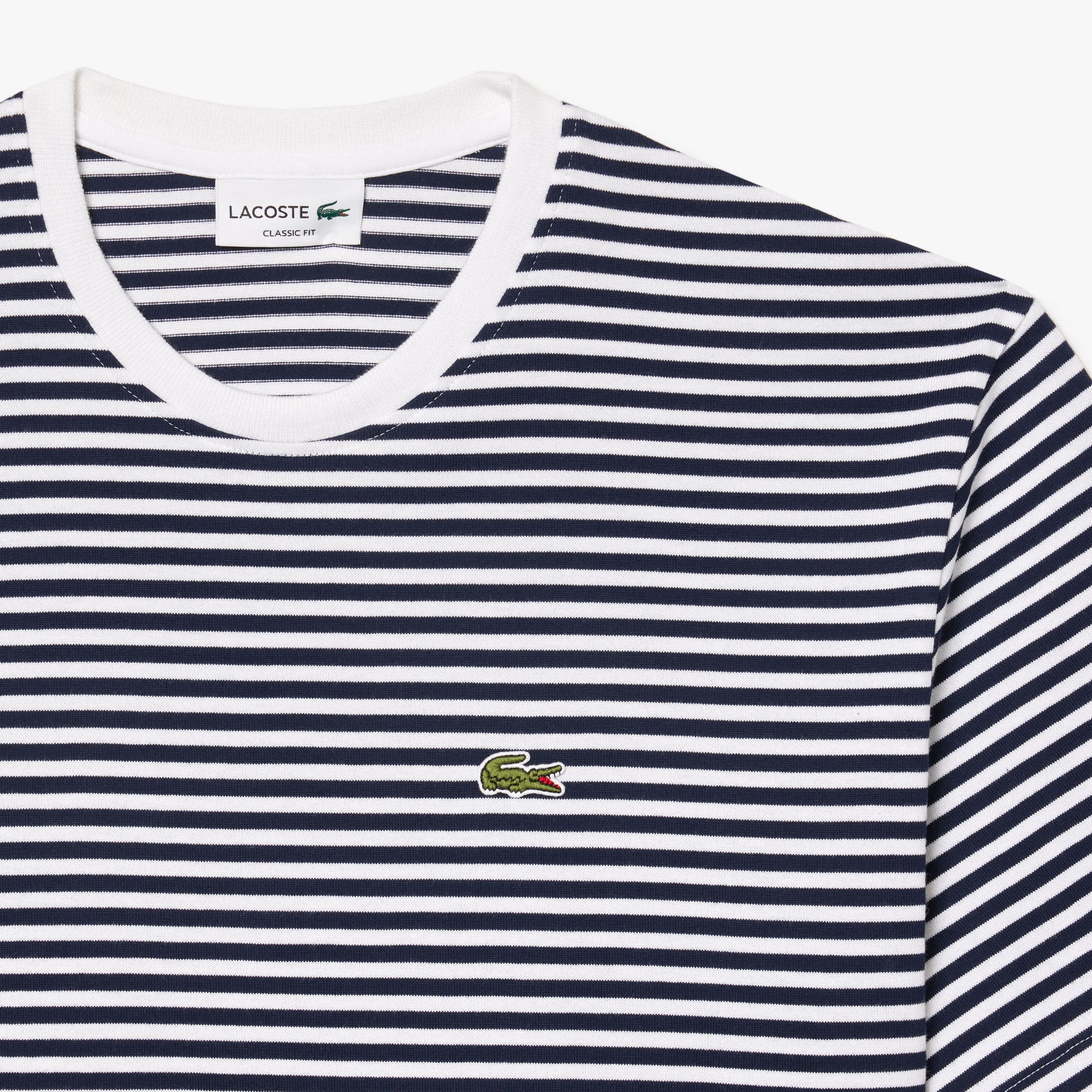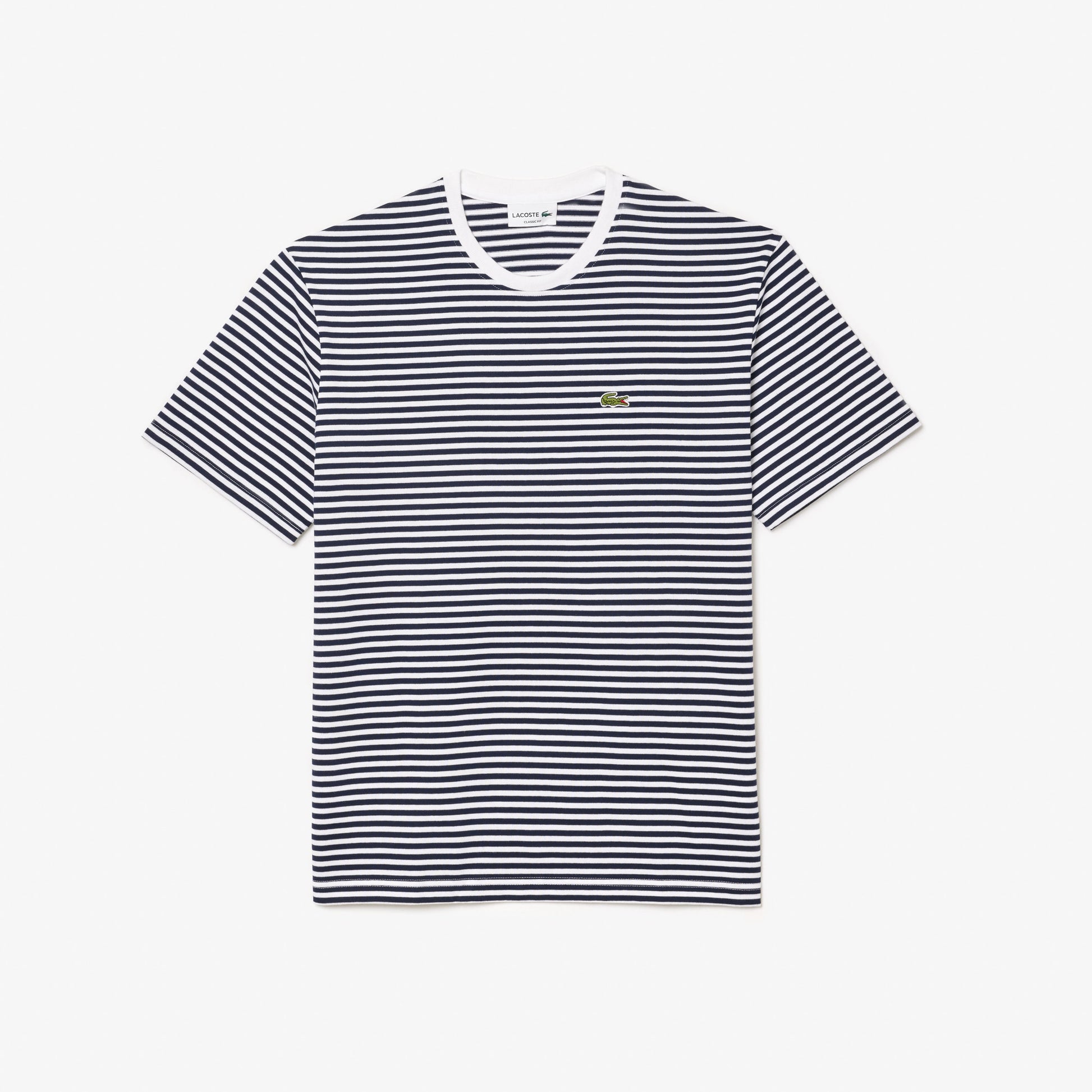 La nuova t-shirt a righe firmata Lacoste è realizzata in morbido e pesante jersey di cotone. Con colletto rotondo e vestibilità comoda, è il capo perfetto per uno stile casual ma di alta qualità. Completa il look con il ricamato coccodrillo sul petto.