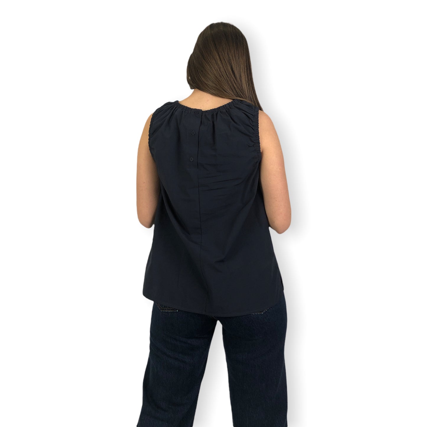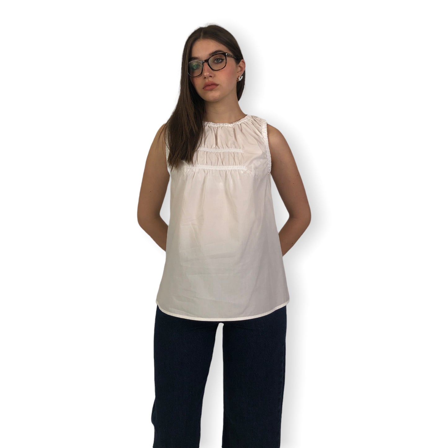 Cod.DT8902 Top in popeline di cotone con motivo di arricciature sul davanti, nello scollo e nel giromaniche.