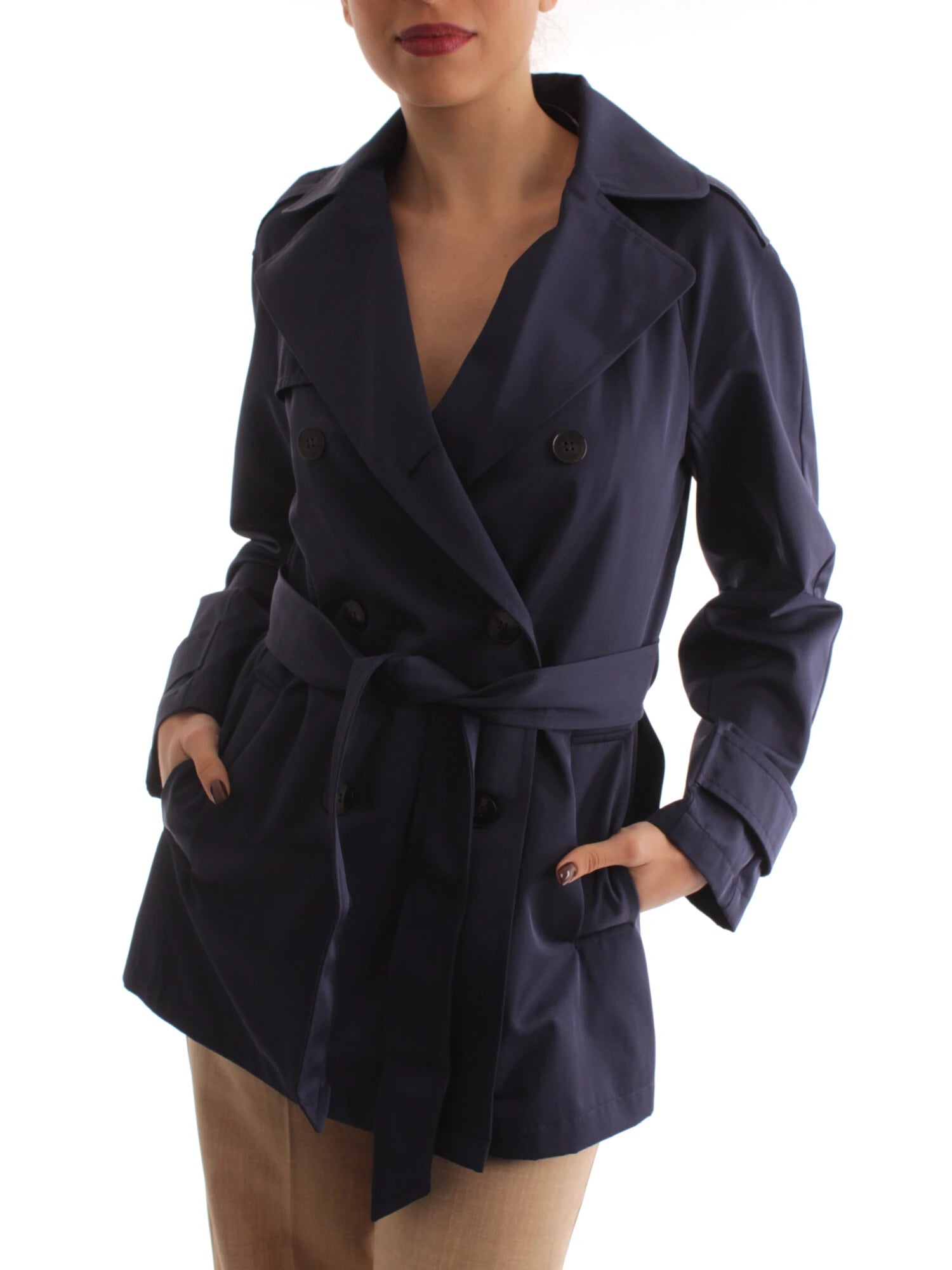 Cod.WEST Trench corto in misto cotone antigoccia, linea dritta. Collo a rever, maniche raglan lunghe con alamari sulle spalle e sui polsi. Chiusura a doppiopetto, tasche a filetto. Spacco centrale sul retro. Sfoderato. Cintura coordinata.